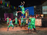 Costume- Traditional Gambhira costumes are still in use. White dhoti, ripped vest to highlight the poverty, bangles in hand to symbolize the fact that people are not free from societal oppression. The main character wears ‘Buki’ (red chest cover) on the chest which is decorated with artificial medals to represent his character who is brave enough to unveil the social evils.