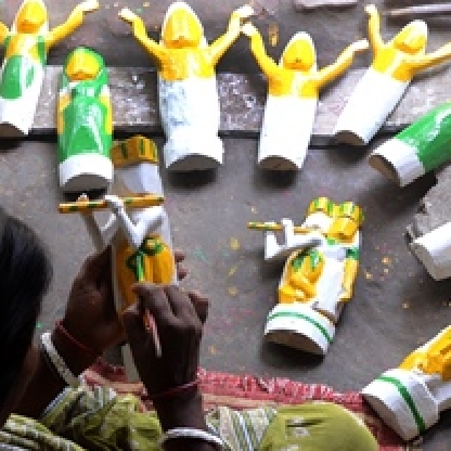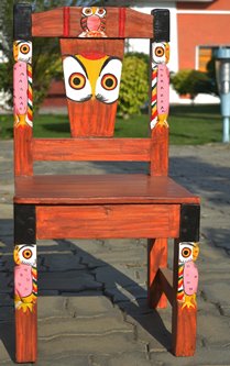 The owl, with its unique design and colour, is the brand product of the village. On the white background of the owl is painted a distinctive design of red, green yellow and black lines. Now the artists make utility products and decorative items using the traditional items like owl, king and queen etc. They make furniture, lampshade etc. They make variety of wooden furniture presently ranging from cots, chairs, table, mirror with wooden doll motifs which is catering to a large market.